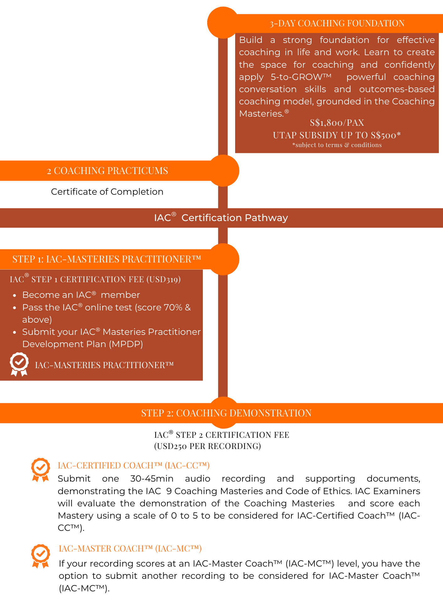 As the only IAC ® Accredited School in Singapore approved to train coaches at the highest level of coaching through the Coaching Masteries, the Academy supports aspiring and certified coaches on the pathway to demonstrating the knowledge, skill and ethical practice of professional coaching standards by providing: